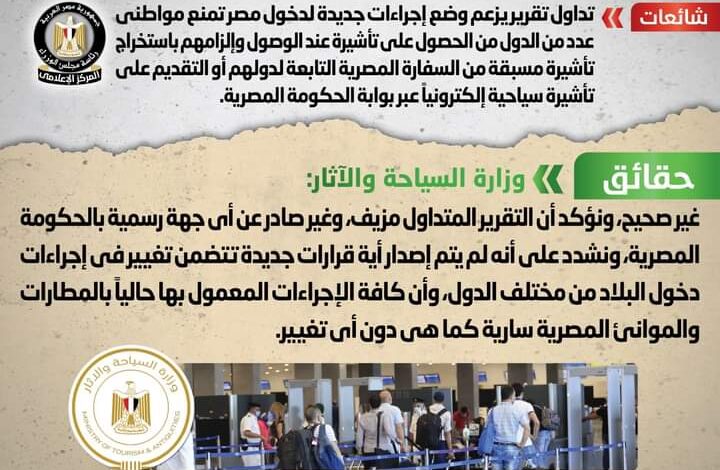قام المركز الإعلامي لمجلس الوزراء بالتواصل مع وزارة السياحة والآثار، والتي نفت تلك الأنباء، مُؤكدةً أنه لا صحة لوضع إجراءات جديدة لدخول مصر تمنع مواطني عدد من الدول من الحصول على تأشيرة عند الوصول وإلزامهم شش تأشيرة مسبقة من السفارة المصرية التابعة لدولهم أو التقديم على تأشيرة سياحية إلكترونياً عبر بوابة الحكومة المصرية، وأن التقرير المتداول مزيف، وغير صادر عن أي جهة رسمية بالحكومة المصرية، مُشددةً على أنه لم يتم إصدار أيه قرارات جديدة تتضمن تغيير في إجراءات دخول البلاد من مختلف الدول، وأن كافة الإجراءات المعمول بها حالياً بالمطارات والموانئ المصرية سارية كما هي دون أي تغيير.