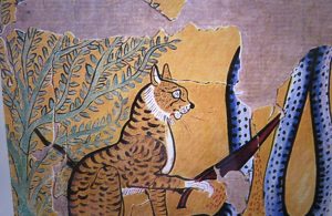 وقال “شاكر”، إن اختيار القط البري تحديدا دونا عن كائنات أخرى لتجسدي “آتوم رع” يرتبط كذلك بقدرته على الرؤية الليلة، منوها بارتباط القطط في وجدان شعوب العالم القديم بالرؤية الليلية الواضحة، لذلك كان أفضل كائن يعبر عن قدرة “آتوم رع” على التعامل مع قوى الظلام والفوضى، لذلك تقول الأسطورة المصرية إن “آتوم رع” يغير هيئته لقط بري ليرى جيدا ويقطع رقبة الظلام.