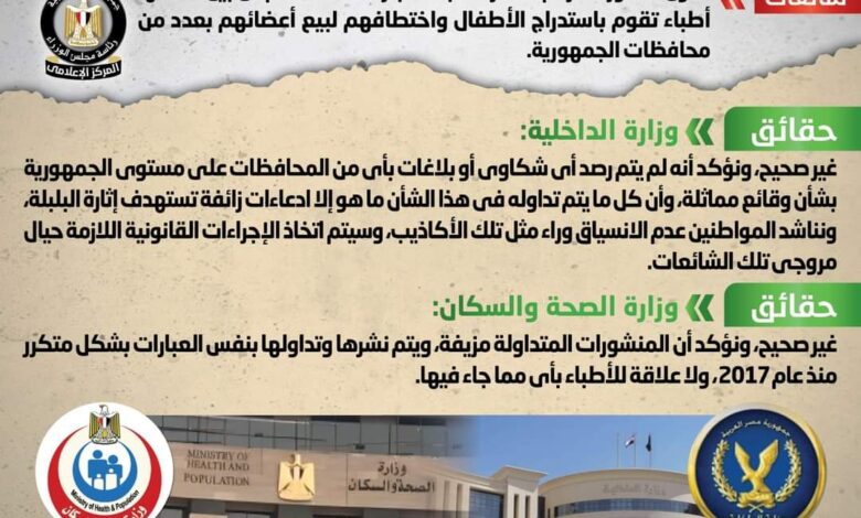 نفت الحكومة ما تداولته بعض صفحات التواصل الاجتماعي من منشورات تزعم انتشار عصابات لتجارة الأعضاء تضم من بين أعضائها أطباء تقوم باستدراج الأطفال واختطافهم لبيع أعضائهم بعدد من محافظات الجمهورية.