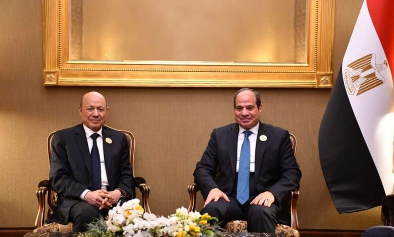 التقى الرئيس عبد الفتاح السيسي اليوم بالدكتور رشاد العليمي رئيس مجلس القيادة الرئاسي اليمني، على هامش أعمال القمة العربية في البحرين.