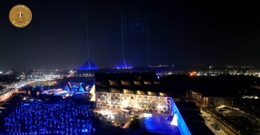 وتبع العرض الجوي للطائرات الشراعية، عروض موسيقية فرعونية ضمن فعاليات الاحتفالية، التي بدأت باستقبال السيد الرئيس عبدالفتاح السيسي وقرينته السيدة انتصار السيسي لضيوف مصر المشاركين في الافتتاح.