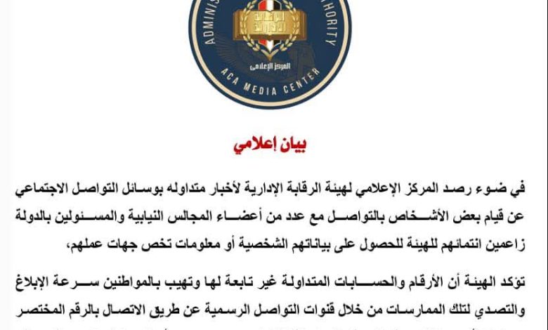 أكدت هيئة الرقابة الإدارية أن المركز الإعلامي للهيئة رصد أخباراً متداولة بوسائل التواصل الاجتماعي، عن قيام بعض الأشخاص بالتواصل مع عدد من أعضاء المجالس النيابية والمسئولين بالدولة، زاعمين انتمائهم للهيئة، للحصول على بياناتهم الشخصية أو معلومات تخص جهات عملهم.