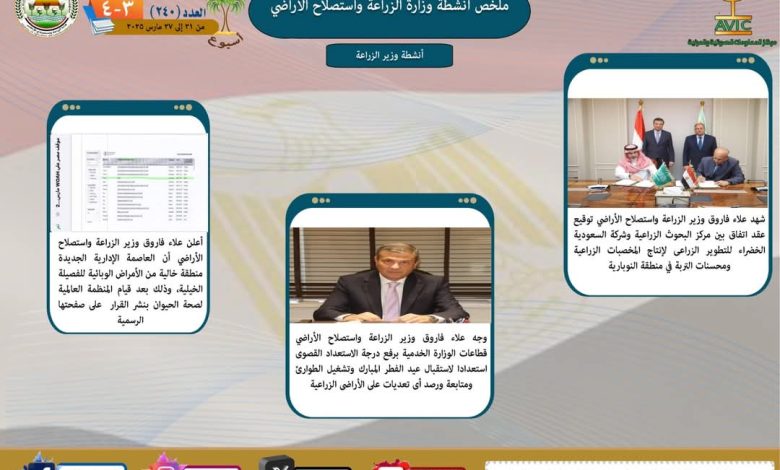 أصدر مركز المعلومات الصوتية والمرئية، التابع لوزارة الزراعة واستصلاح الاراضي، “الانفوجراف الاسبوعي” في نسخته رقم ٢٤٠ حول الحصاد الاسبوعي لأهم أنشطة الوزارة، خلال الاسبوع الماضي في الفترة من ٢١ وحتى ٢٧ مارس الجاري، وذلك بالتعاون مع المكتب الاعلامي للوزارة، كما أصدر المركز ايضا ملخصا بالفيديو، حول انشطة الوزارة خلال نفس الفترة.