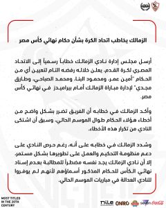 وأكد الزمالك حرصه على دعم منظومة التحكيم والعمل علي تطويرها بشكل مستمر لكنه يجد نفسه مضطرا للمطالبة بعدم إسناد نهائي كأس مصر لأي من الحكام المذكورة أسماؤهم.