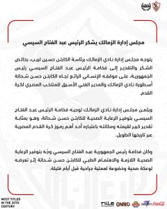 وقال الزمالك في رسالته: “مجلس إدارة النادي برئاسة الكابتن حسين لبيب، يتقدم بخالص الشكر والتقدير إلى فخامة الرئيس عبد الفتاح السيسي، رئيس الجمهورية، على موقفه الإنساني الرائع تجاه الكابتن حسن شحاتة، أسطورة نادي الزمالك والمدير الفني الأسبق للمنتخب المصري”.