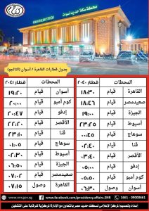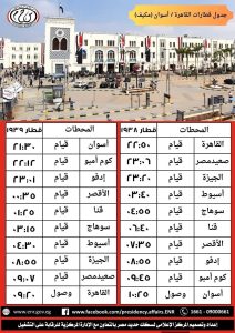 – إعتبارا من يوم الخميس الموافق 22/1/2026 تشغيل قطار 1938 (مكيف) من القاهرة/أسوان حتي يوم الأحد الموافق 15/2/2026 حيث يقوم من القاهرة الساعة 22:50 ويصل أسوان الساعة 10:25 طبقاً للجدول المرفق.