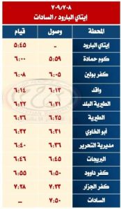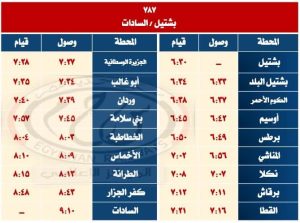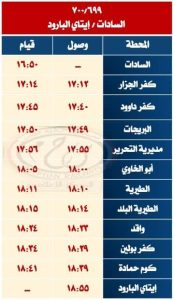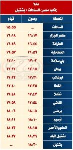 وتقرر تشغيل قطار 708 / 709 إيتاى البارود / السادات ( تحيا مصر ) يقوم من محطة إيتاى البارود الساعة 05:45 ويصل محطة السادات الساعة 07:50 طبقاً للجدول المرفق ، وكذلك تشغيل قطار 699 / 700 السادات / إيتاى البارود ( تحيا مصر ) يقوم من محطة السادات الساعة 16:50 ويصل محطة إيتاى البارود الساعة 18:55 طبقاً للجدول المرفق ويترتب على ما سبق تعديل جدول مسير قطار 787 بشتيل / السادات يقوم من محطة بشتيل الساعة 06:30 ويصل محطة السادات الساعة 09:10 طبقاً للجدول المرفق ،مع استمرار جدول مسير قطار 788 السادات / بشتيل كجدوله الحالى.