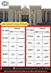 وأشارت إلى أنه سيتم تشغيل قطار رقم 1090 بعربات مختلطة (نوم / جلوس VIP Premium )، في الأول من فبراير المقبل فقط من محطة صعيد مصر الساعة 22.55 ليصل لمحطة أسوان الساعة 10.10، بالإضافة إلى تشغيل قطار رقم 1091 بعربات مختلطة (نوم / جلوس VIP Premium ) يومي 31 يناير الجاري و 2 فبراير المقبل فقط من محطة أسوان الساعة 16.50 ليصل محطة صعيد مصر الساعة 4.35.