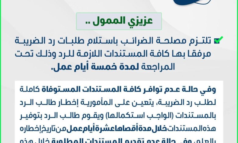 وذكر الإنفوجراف أن المصلحة تلتزم باستلام طلبات رد الضريبة مرفقا بها كافة المستندات اللازمة للرد، وذلك تحت المراجعة لمدة 5 أيام عمل، موضحا أنه في حالة عدم توافر كافة المستندات المستوفاة كاملة لطلب رد الضريبة، يتعين على المأمورية إخطار طالب الرد بالمستندات (الواجب استكمالها) ويقوم طالب الرد بتوفير هذه المستندات خلال مدة أقصاها 10 أيام عمل من تاريخ إخطاره بالعلم.