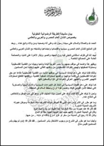 كما شدد البيان على أن الدفاع عن الوطن وحماية أراضيه هو واجب ديني ووطني، مستشهدًا بموقف سيدي الشيخ أحمد رضوان، الذي كان شديد الحب لوطنه، كثير الدعاء له، ومخلصًا في النصح لقادته، حيث كان من دعائه: “اللهم لا تمتني حتى أرى إسرائيل في البحر.”