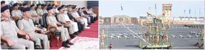 كما شاركت قوات المظلات بإستعراض مهاراتها الإحترافية بإستخدام معدات الدلتا وإسقاط مجموعات القفز الحر ، وقدمت الموسيقات العسكرية عرضاً متميزاً عكس مدى التوافق الحركى والتناغم فى الأداء ، وإختتمت العروض بالعرض العسكرى شارك فيه مجموعات من طلبة المعهد يتقدمهم حملة الأعلام ، وعزفت الموسيقات العسكرية سلام الشهيد فى تقليد راسخ وأصيل عرفاناً بتضحيات شهدائنا الأبرار , وتم تكريم أسرة الشهيد مساعد محمد محمود مصطفى حربى تقديراً لما قدمه للوطن من تضحية وفداء.