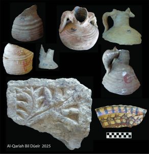 وأوضح  وليد السيد رئيس البعثة الأثرية، أن البعثة عثرت بالموقع على عدد من اللقى الأثرية، من بينها أمفورات كانت تُستخدم في التخزين، تحمل بعضها كتابات يُحتمل أن تكون حروفًا أو أرقامًا أو أسماء مدونة على أكتافها، إلى جانب مجموعة من الأوستراكات تحمل كتابات باللغة القبطية، وعدد من أدوات المعيشة، وكسَر حجرية تمثل أجزاء من عناصر معمارية، بالإضافة إلى أجزاء من لوحات من الحجر الجيري منقوش عليها كتابات بالخط القبطي.