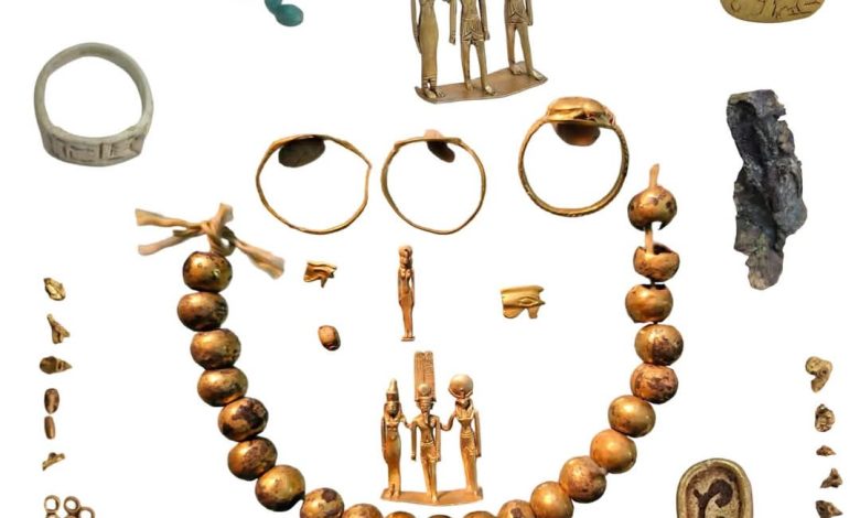 الكشف عن مجموعة من الخواتم التمائم والحلى المصنوع من الذهب والأحجار الكريمة