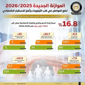 وأشارت الإنفوجرافات إلى زيادة معاش الضمان الاجتماعي و”تكافل وكرامة” بنسبة 22.7%، ليصل إلى 54 مليار جنيه عام 2025/2026، مقارنة بـ 44 مليار جنيه عام 2024/2025، فضلًا عن زيادة دعم الأدوية وألبان الأطفال بنسبة 25%، ليصل إلى 5 مليارات جنيه عام 2025/2026، مقارنة بـ 4 مليارات جنيه عام 2024/2025.