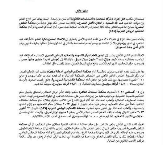 وقال المحامي هاني زهران، دفاع اللاعب عبد السعيد، إن الحكم أصبح باتًا ونهائيًا لينتهي النزاع القانوني القائم بين موكله والنادي الأهلي في جميع المحاكم المصرية والدولية.