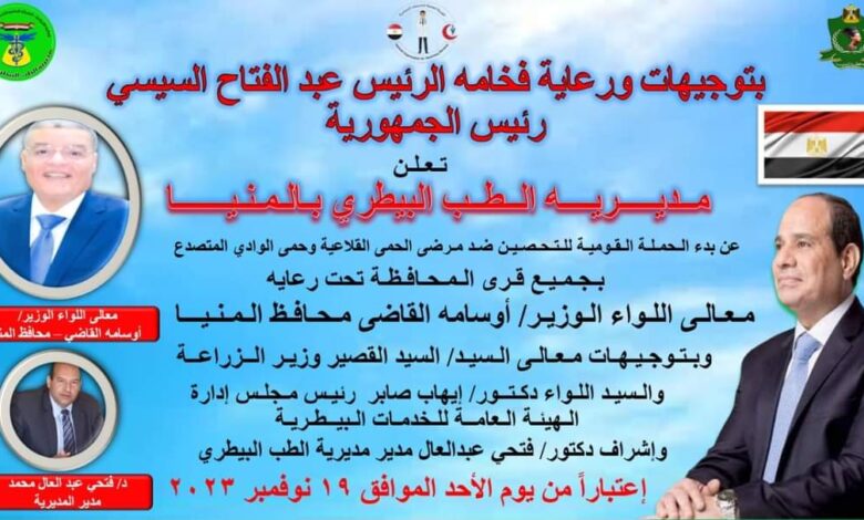 أعلن الدكتور فتحي عبد العال مدير مديرية الطب البيطري بالمنيا بأنه بناء على توجيهات اللواء اسامه القاضي محافظ المنيا والسيد القصير وزير الزراعة و استصلاح الأراضي و اللواء دكتور إيهاب صابر رئيس مجلس إدارة الهيئة العامة للخدمات البيطرية سوف تنطلق اليوم الأحد الحملة القومية الثالثة للتحصين ضد مرض الحمى القلاعية وحمى الوادي المتصدع والترقيم والتسجيل فى جميع قرى مراكز محافظة المنيا.
