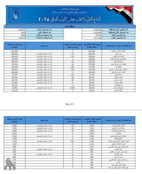 ومن المقرر أن تنشر وكالة الأنباء العراقية خلال الساعات المقبلة التفاصيل الكاملة للنتائج الأولية، بما في ذلك عدد المقاعد التي حصلت عليها الكتل والأحزاب السياسية في مختلف المحافظات.
