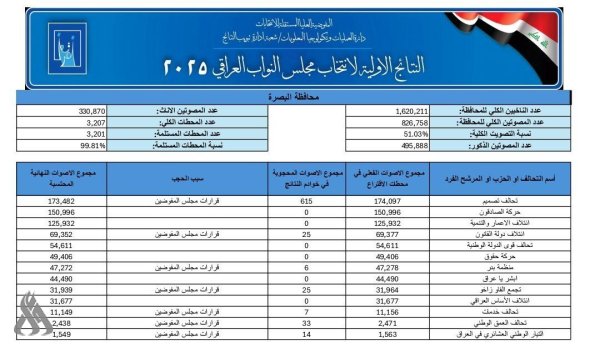 النتائج الأولية لانتخابات مجلس النواب العراق 2025، أعلنت المفوضية العليا المستقلة للانتخابات في العراق، اليوم الأربعاء، النتائج الأولية لانتخابات مجلس النواب لعام 2025، مؤكدة أن العملية الانتخابية جرت بسلاسة وشفافية عالية.