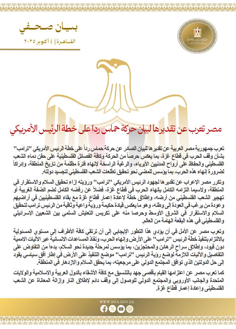 أعربت جمهورية مصر العربية، عن تقديرها عن بيان حركة حماس ردا على خطة الرئيس ترامب.