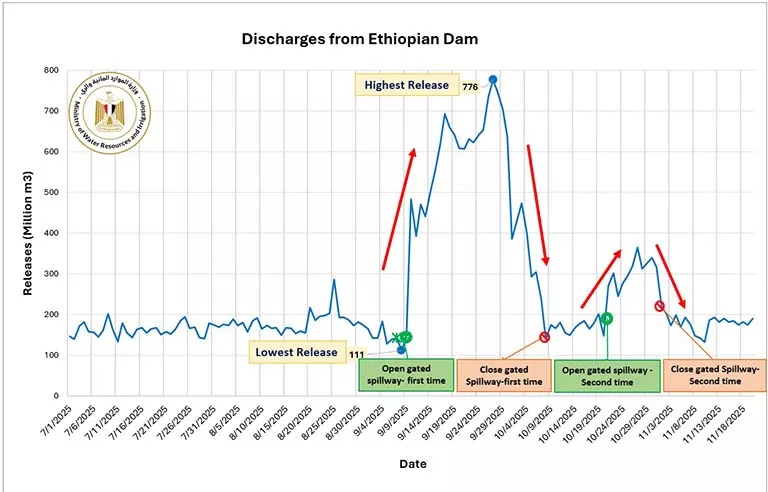 وذكرت الوزاراة، في البيان، إنه في 21 أكتوبر 2025، ارتفع التصريف فجأة إلى 300 مليون م³ يوميًا بعد فتح مفيض الطوارئ—المخصص للحالات الاستثنائية فقط—واستمرت التصريفات عند 320 مليون م³ لمدة 10 أيام، في 31 أكتوبر، تم إغلاق المفيض مرة أخرى، وبلغ متوسط التصريف من 1 إلى 20 نوفمبر نحو 180 مليون م³ يوميًا، بزيادة 80% عن المتوسط التاريخي البالغ 100 مليون م³ لنفس الفترة.