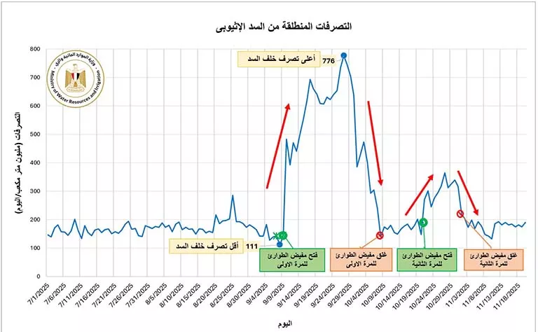 أشارت الوزارة إلى أن إثيوبيا سارعت بغلق مفيض الطوارئ في 8 أكتوبر 2025، ما أدى لتراجع التصريفات إلى 139 مليون م³ يوميًا، ثم إلى متوسط 160 مليون م³ حتى 20 أكتوبر، أي تشغيل نصف التوربينات فقط.