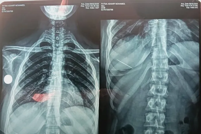 وكانت الفتاة قد وصلت إلى قسم الطوارئ وهي تعاني من آلام حادة في الصدر وسعال مستمر وصعوبة في التنفس، وبإجراء الأشعة والفحوصات اللازمة تبين وجود دبوس معدني في الرئة وآخر بالمعدة.