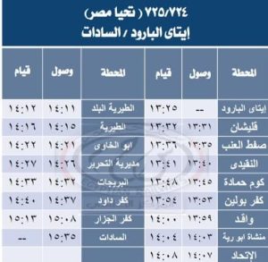 وتقرر اعتباراً من يوم الثلاثاء الموافق 5 / 8 / 2025 تشغيل قطار رقم 724 / 725 ( إيتاى البارود – السادات ) وقطار رقم 727 / 726 ( السادات / إيتاى البارود ) ، وتعمل جميع أيام الأسبوع ماعدا يوم الجمعة والعطلات الرسمية وطبقاً للجداول المرفقة .