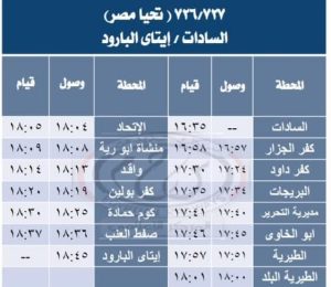 وتقرر اعتباراً من يوم الثلاثاء الموافق 5 / 8 / 2025 تشغيل قطار رقم 724 / 725 ( إيتاى البارود – السادات ) وقطار رقم 727 / 726 ( السادات / إيتاى البارود ) ، وتعمل جميع أيام الأسبوع ماعدا يوم الجمعة والعطلات الرسمية وطبقاً للجداول المرفقة .