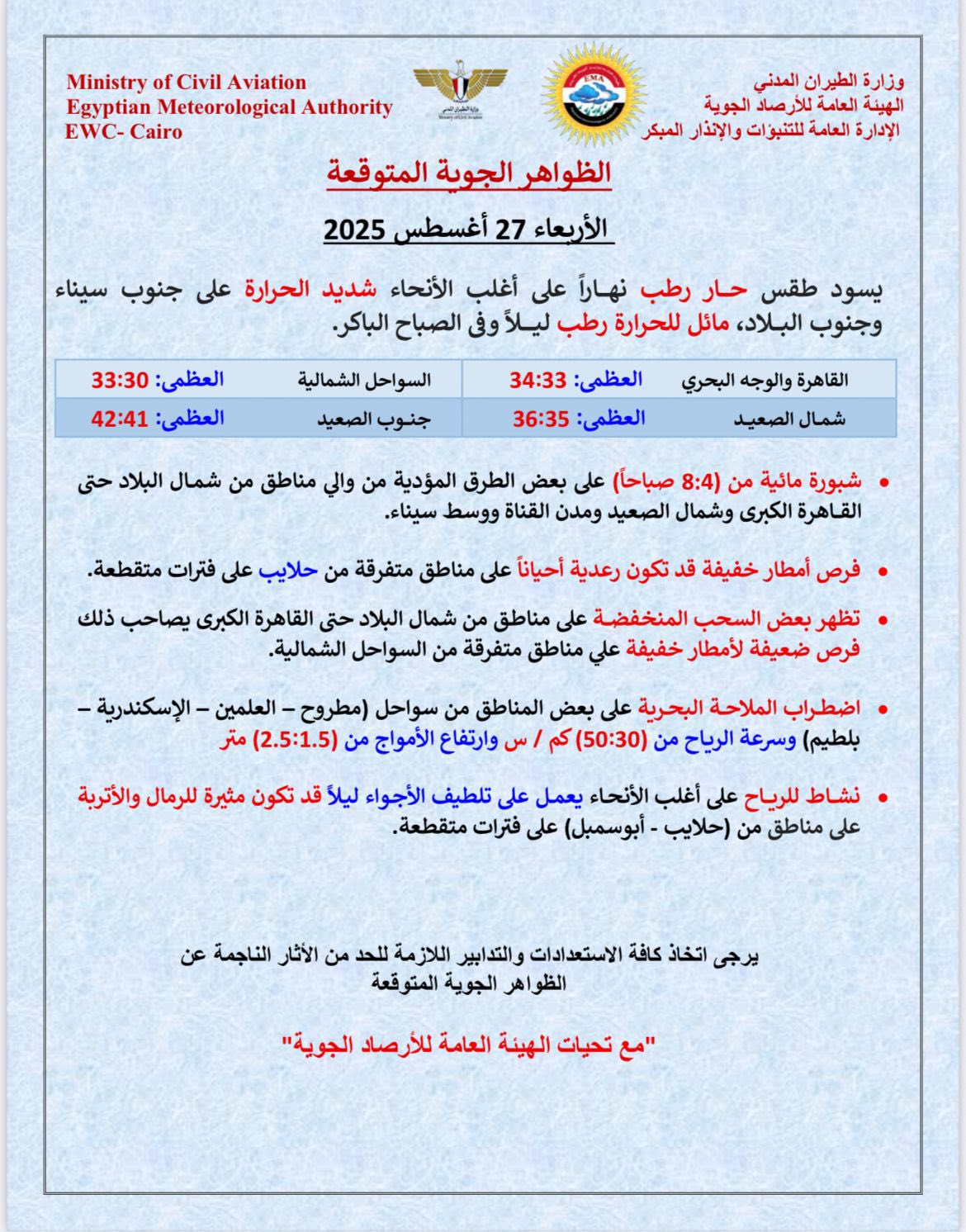 حالة الطقس غدًا الأربعاء 27-8-2025 في مصر