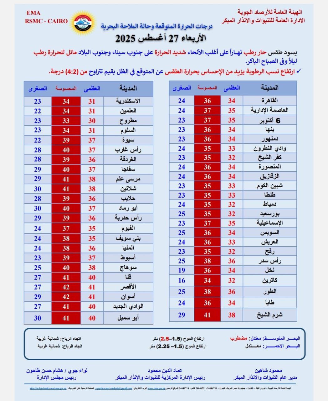 ونستعرض معكم بشكل تفصيلي درجات الحرارة المتوقعة غدًا الأربعاء الموافق 27-8-2025 وهي كالتالي: