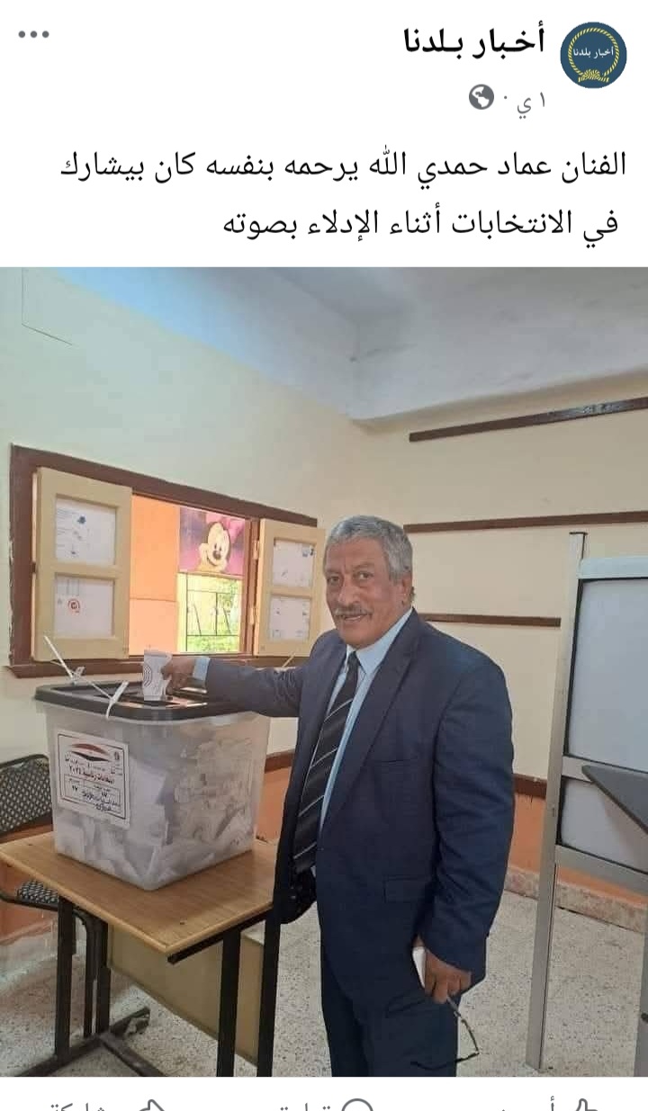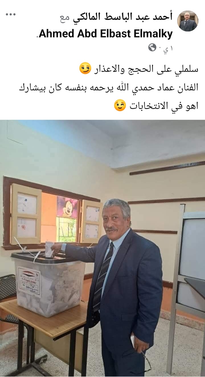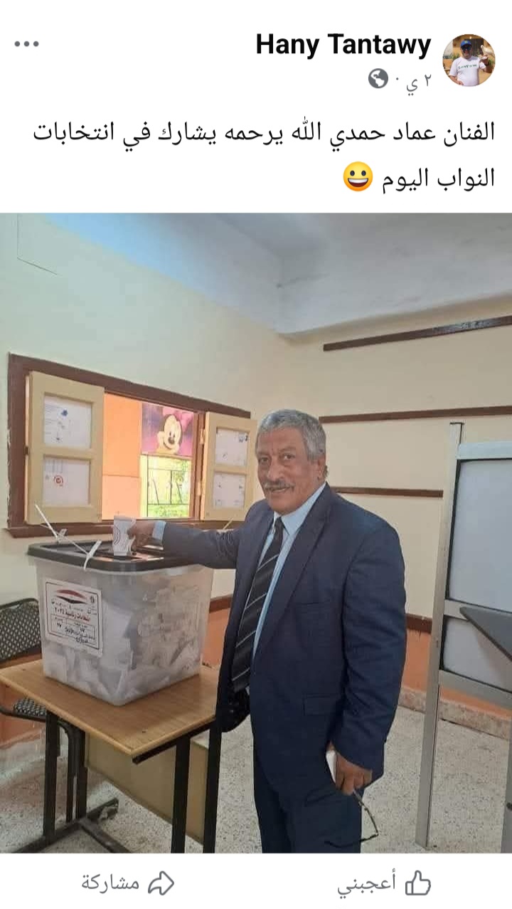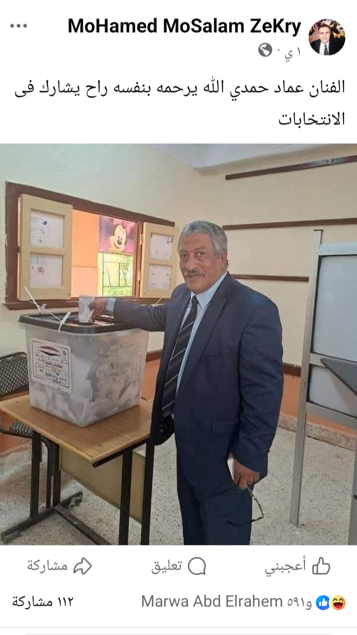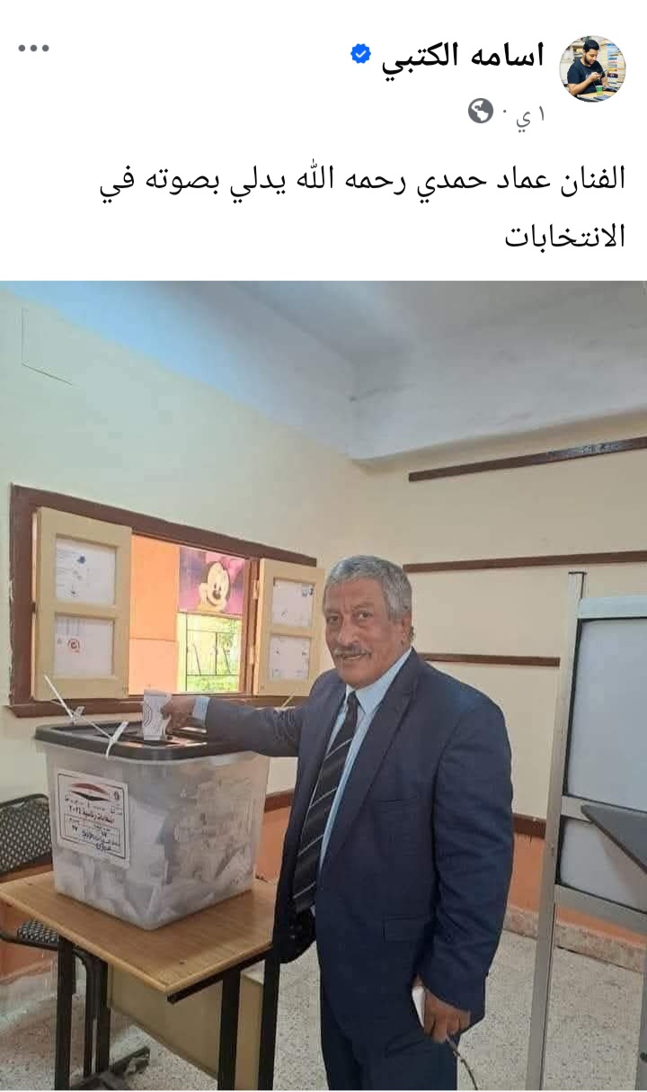 الحقيقة المؤكدة أن الفنان الراحل عماد حمدي لم “يعد للحياة” ليصوت في الانتخابات كما روّج البعض، وأن صاحب الصورة هو الكابتن مجدي الشيخ من محافظة قنا، الذي تربطه بالفنان الراحل ملامح متشابهة فقط دون أي صلة قرابة.
