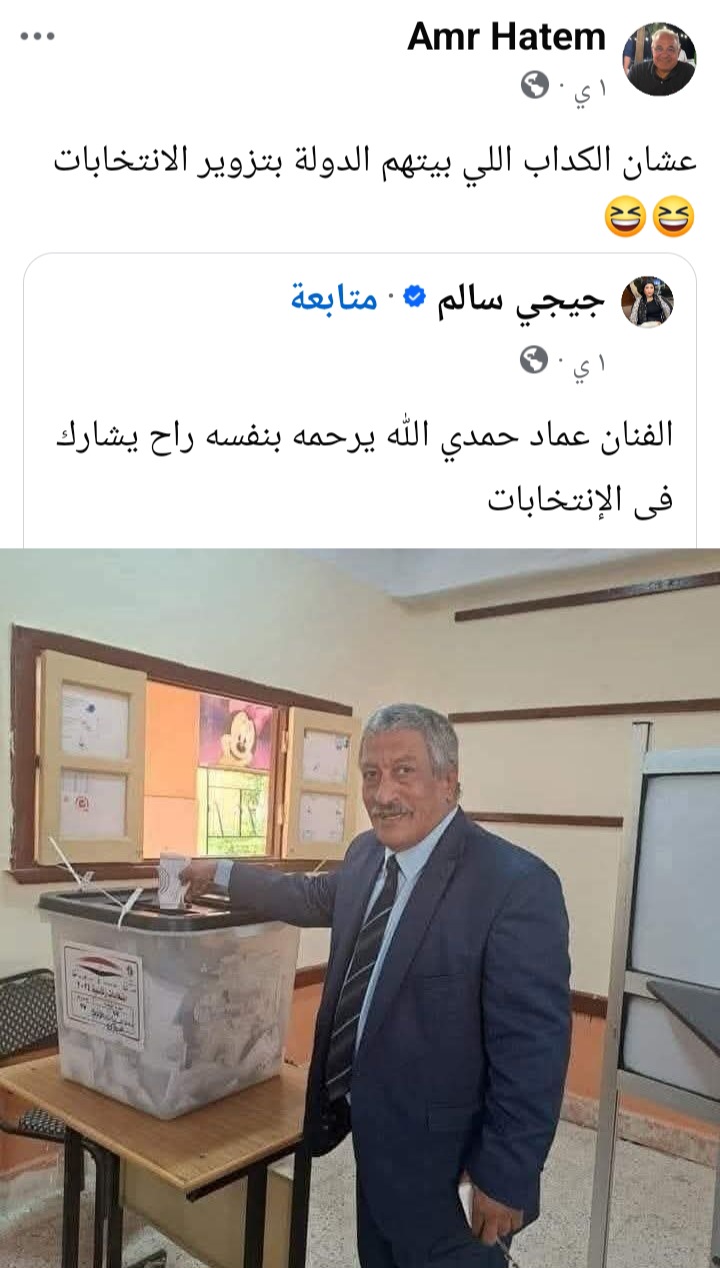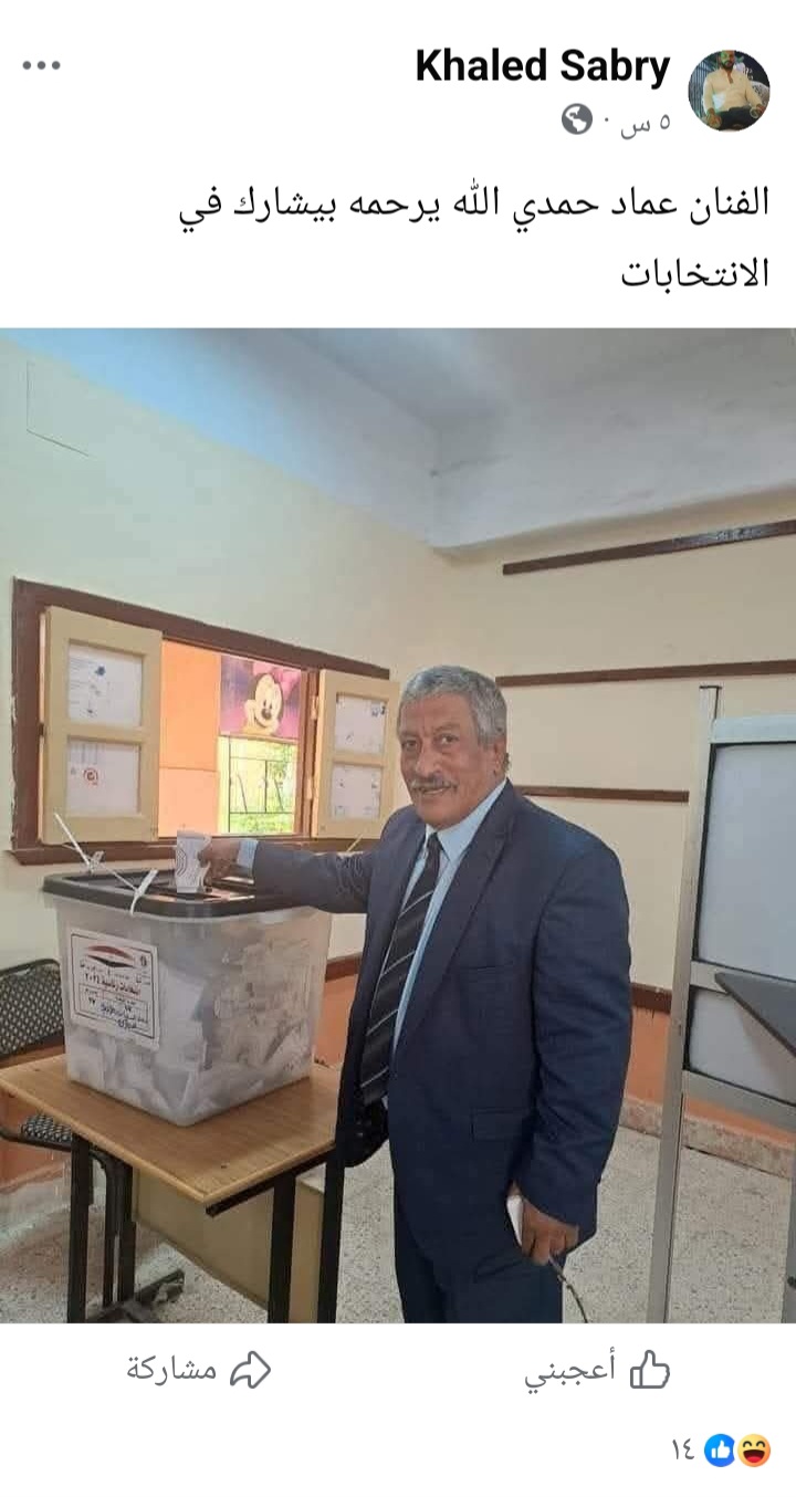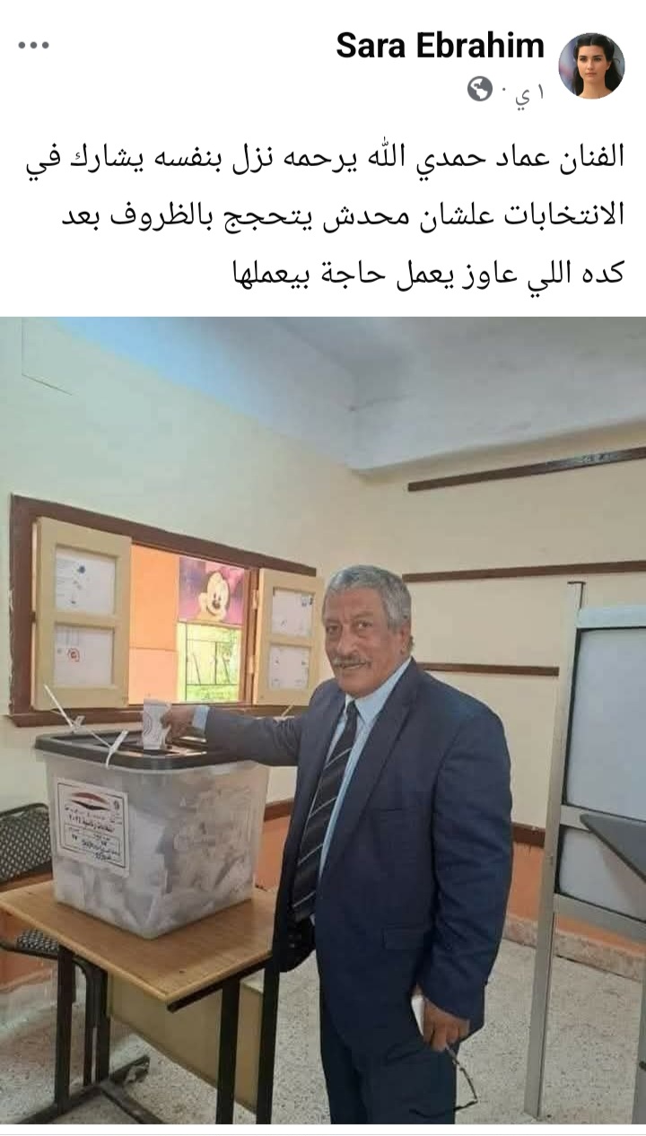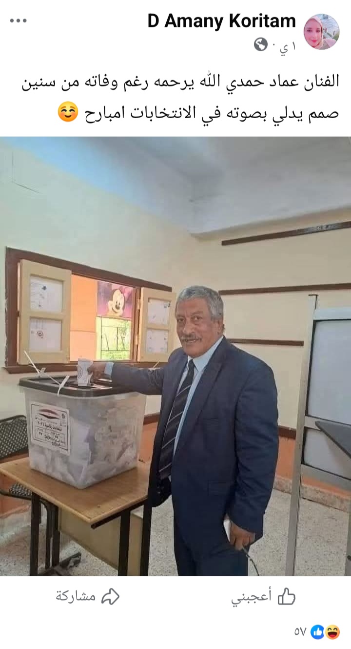 الحقيقة المؤكدة أن الفنان الراحل عماد حمدي لم “يعد للحياة” ليصوت في الانتخابات كما روّج البعض، وأن صاحب الصورة هو الكابتن مجدي الشيخ من محافظة قنا، الذي تربطه بالفنان الراحل ملامح متشابهة فقط دون أي صلة قرابة.