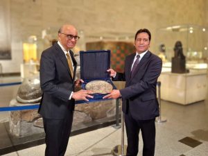 وكان في استقبال الرئيس والوفد المرافق له الدكتور الطيب عباس الرئيس التنفيذي لهيئة المتحف، الذي رحب بهم وقدم نبذة عن الموقع المتميز للمتحف وتاريخه، والدور الثقافي والمجتمعي الذي يضطلع به باعتباره أحد أبرز الصروح المتحفية في مصر والشرق الأوسط، كما قدم للرئيس هدية تذكارية تعبيراً عن التقدير لهذه الزيارة.