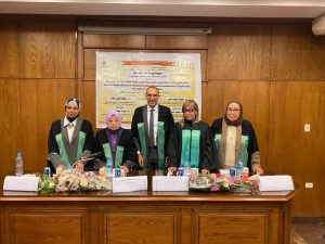وتكونت لجنة الحكم والمناقشة من كوكبة من كبار العلماء المختصينن وهم: الدكتورة فاطمة محمد حلمي أستاذ دراسة مواد الآثار وصيانتها ورئيس قسم ترميم الأثار الأسبق ومدير مركز صيانة الآثار والمخطوطات ومقتنيات المتاحف الأسبق بكلية الآثار جامعة القاهرة مشرفا ورئيساً، والدكتورة منى حسين عبدالغني أستاذ ترميم الأيقونات والكارتوناج المساعد بقسم ترميم الآثار بالكلية مشرفا مشاركا، والدكتورة وفيقة نصحي وهبة أستاذ ترميم المخطوطات والمواد العضوية ووكيل الكلية لشئون خدمة المجتمع والآثار وتنمية البيئة الأسبق بالكلية عضواً مناقشًا، والدكتورة يسرية مصطفى حسن أستاذ باحث بقسم البوليمرات والمخضبات المركز القومي للبحوث عضواً مناقشا.