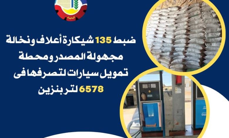 ضبط محطة تمويل سيارات لتصرفها في ٦٥٧٨ لتر بنزين، بالإضافة لضبط ١٠٠٠ لتر سولار تم تجميعهم داخل مصنع حلويات بدون وجه حق ،كما تم ضبط ٧٥ شيكارة علف و٦٠ شيكارة نخالة مجهولة المصدر داخل مخازن بيع الأعلاف ،وقد تم إتخاذ جميع الإجراءات القانونية اللازمة حيال المخالفين.