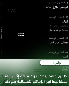 شهد موقع التواصل الاجتماعي إكس، تويتر سابقًا، حالة من التفاعل غير المسبوق، بعدما تصدّر اسم النجم الدولي طارق حامد قائمة الأكثر تداولًا في مصر، إثر إطلاق جماهير نادي الزمالك هاشتاج للمطالبة بعودته إلى القلعة البيضاء خلال فترة الانتقالات الصيفية المقبلة.