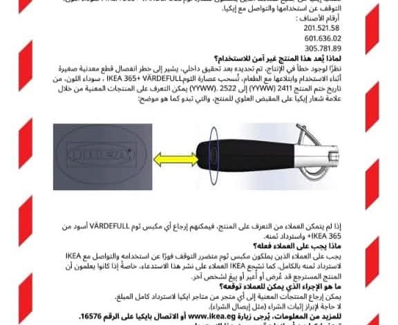 أعلنت شركة “ايكيا ” العاملة في مجال الأثاث المنزلي والتجهيزات المنزلية ، عن استدعاء عصارة الثومIKEA 365+ VÄRDEFULL، سوداء اللون ، نظرًا لوجود خطأ في الإنتاج، تم تحديده بعد تحقيق داخلي، يشير إلى خطر انفصال قطع معدنية صغيرة أثناء الاستخدام داخل الطعام دون ملاحظة المستخدم، الأمر الذي قد يُسبب مخاطر صحية جسيمة في حال ابتلاعها، ويمثل تهديدًا مباشرًا لسلامة وصحة مُستخدميها.