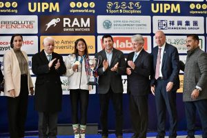 وقام بتسليم الدكتور أشرف صبحي وزير الشباب والرياضة، والنائبة الدكتورة آية مدني عضو اللجنة الأولمبية الدولية، وروب ستول رئيس الاتحاد الدولي، ودكتور طارق شوقي ممثل الجامعة الأمريكية بالقاهرة، والمهندس شريف العريان رئيس الاتحاد المصري، واللواء إسماعيل موسى رئيس اتحاد شمال افريقيا، والدكتور شادي عبد العزيز أمين صندوق الاتحاد المصري، ودكتورة ليلى جينيسي عضو مجلس إدارة الاتحاد الدولي للخماسي الحديث.