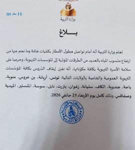تواجه تونس وضعاً كارثياً جراء فيضانات تونس التي اجتاحت البلاد مؤخراً، مما دفع وزارة التربية التونسية إلى اتخاذ قرار عاجل بتعليق الدراسة في 15 ولاية من أصل 24.