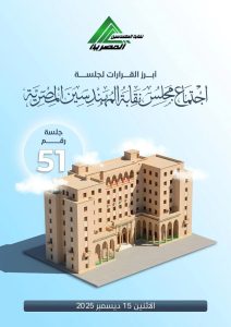 أصدر مجلس النقابة العامة للمهندسين، برئاسة المهندس طارق النبراوي، حزمة من القرارات التاريخية خلال اجتماعه رقم (51)، الذي عُقد لمناقشة ملفات حيوية تمس مصالح المهندسين وأسرهم، وعلى رأسها انتخابات عام 2026 وتطوير مشروع الرعاية الصحية.