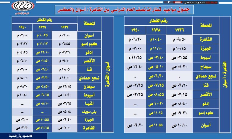 وجاءت مواعيد القطارات الإضافية بالسكة الحديد كالتالي :