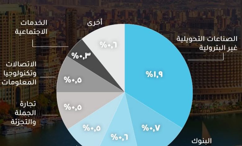 وجاء قطاع البنوك في المرتبة الثانية بين أكثر القطاعات مساهمة في نمو الناتج المحلي بنسبة 0.7%، ثم المطاعم والفنادق 0.6%، والزراعة والغابات والصيد، وتجارة الجملة والتجزئة، والاتصالات وتكنولوجيا المعلومات بنسبة 0.5% لكل قطاع.