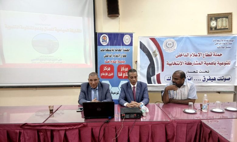نظم مجمع إعلام قنا ندوة بعنوان “المشاركة السياسية للعمال ودعم منظومة التنمية” للعاملين بمصنع سكر قوص، ضمن حملة قطاع الإعلام الداخلي بالهيئة العامة للاستعلامات “صوتك هيفرق.. إنزل وشارك”، بحضور يوسف رجب، مدير مجمع إعلام قنا، وصلاح عبد الصبور، مدير إدارة التدريب بالمصنع، وألقى المحاضرة الدكتور علي الدين عبد البديع القصبى، الأستاذ المساعد لعلم الاجتماع بجامعة جنوب الوادي.