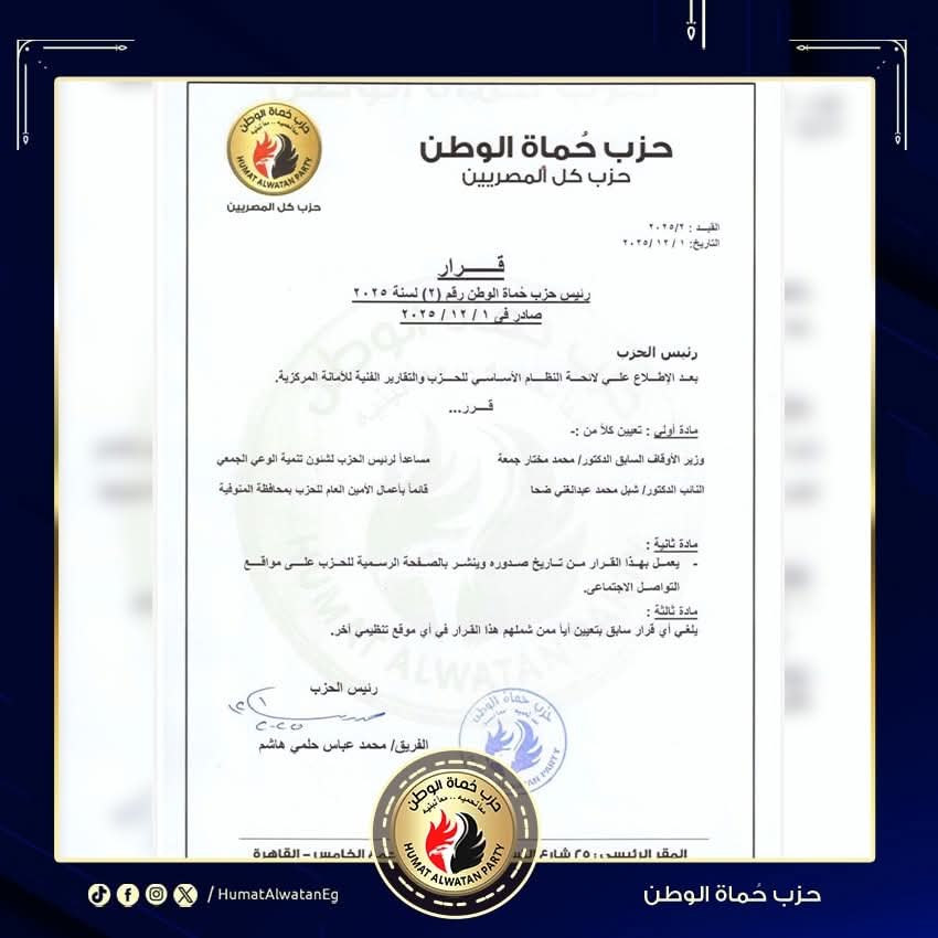 أصدر الفريق محمد عباس حلمي، رئيس حزب حماة الوطن، قراراً بتعيين الدكتور محمد مختار جمعة، وزير الأوقاف السابق، مساعداً لرئيس الحزب لشؤون تنمية الوعي المجتمعي.