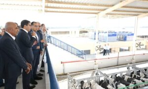 وفي هذا الإطار، أوضح رئيس الشركة أنه تم إقامة مزرعة الشركة، التي يتم تفقدها اليوم، على مساحة إجمالية تبلغ 2700 فدان تقع في منطقة غرب النوبارية على ترعة النصر مباشرة من مدخل الكيلو 75 طريق إسكندرية القاهرة الصحراوي؛ حيث يتم استخدام أساليب الري الحديثة في الزراعة، وتنقسم الزراعات بها إلى شقين: أشجار فاكهة، ومحاصيل أعلاف لتربية الإنتاج الحيواني متمثلة في محصوليْ البرسيم والذرة، مضيفا أنه تم كذلك إنشاء محطة إنتاج حيواني على مساحة 150 فدانا تضم 57 عنبرا؛ حيث تصل الطاقة الإجمالية للانتاج الحيواني إلى 17 ألف رأس، ويتوافر بالمزرعة حاليا 12 ألف رأس تتنوع ما بين أبقار حلاب، وعجلات عشار وتحت عشار، وعجول رضيعة، لافتا إلى أن الأبقار المتوافرة بالمزرعة من أفضل أنواع الأبقار على مستوى العالم، وتسمى “هولشتاين” وجار استكمال طاقة المزرعة خلال الفترة المقبلة.
