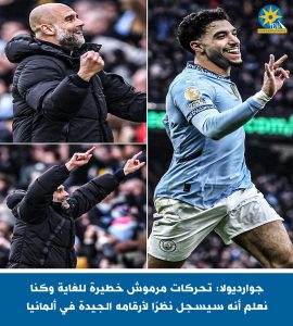 وعقب المباراة، قال جوارديولا: “إن تحركات مرموش خطيرة للغاية كنا نعلم أنه سيسجل عاجلاً أم آجلاً، حيث حقق في ألمانيا ومع أينتراخت فرانكفورت أرقامًا جيدة”.