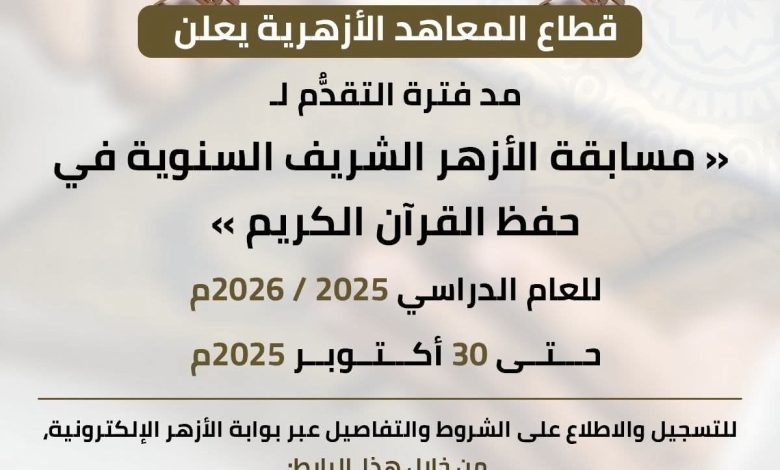 وكانت الإدارة العامة لشئون القرآن الكريم بقطاع المعاهد الأزهرية قد أعلنت عن فتح باب التقدم لمسابقة الأزهر الشريف السنوية في حفظ القرآن الكريم، للعام الدراسي 2025/ 2026م (مسابقة شيخ الأزهر للقرآن الكريم سابقًا)، السبت، الموافق 4 أكتوبر 2025م، ولمدة خمسة عشر يومًا.