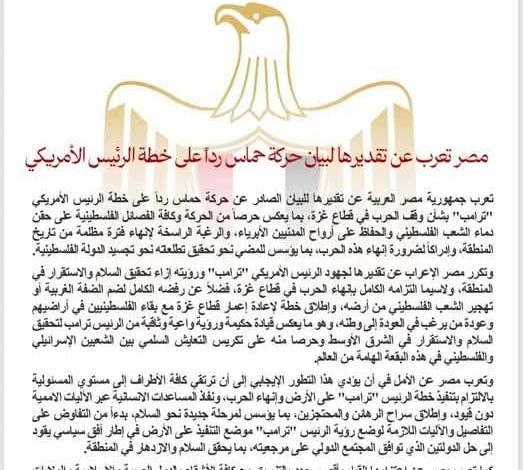 أعربت مصر عن تقديرها للبيان الصادر عن حركة حماس رداً على خطة الرئيس الأمريكي “ترامب” بشأن وقف الحرب في قطاع غزة، بما يعكس حرصاً من الحركة وكافة الفصائل الفلسطينية على حقن دماء الشعب الفلسطيني والحفاظ على أرواح المدنيين الأبرياء، والرغبة الراسخة لإنهاء فترة مظلمة من تاريخ المنطقة، وإدراكاً لضرورة إنهاء هذه الحرب، بما يؤسس للمضي نحو تحقيق تطلعاته نحو تجسيد الدولة الفلسطينية.