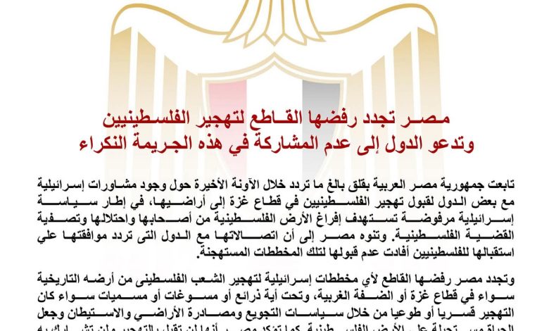 قالت مصر إنها تتابع بقلق بالغ ما تردد خلال الآونة الأخيرة حول وجود مشاورات إسرائيلية مع بعض الدول لقبول تهجير الفلسطينيين في قطاع غزة إلى أراضيها، في إطار سياسة إسرائيلية مرفوضة تستهدف إفراغ الأرض الفلسطينية من أصحابها واحتلالها وتصفية القضية الفلسطينية.