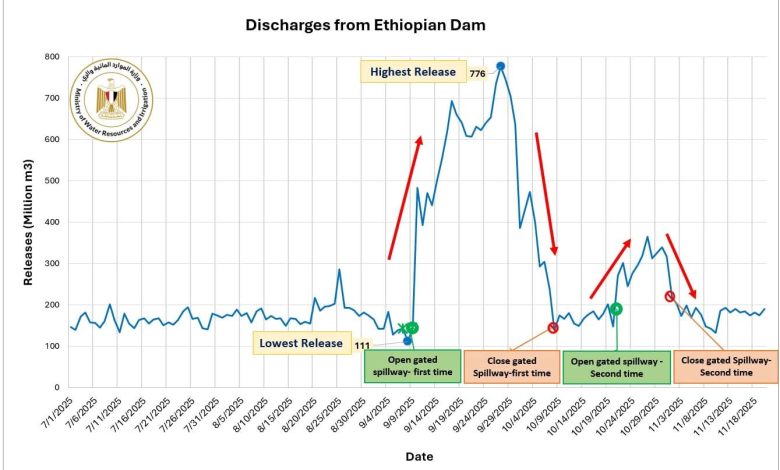 وقالت الوزارة في بيانها إنه سبق لها توضيح أن مُشغّل السد الإثيوبي قام، عقب ما وصفه بـ”الافتتاح”، في 10 سبتمبر 2025 بتصريف كميات كبيرة من المياه بلغت نحو 485 مليون متر مكعب، أعقبها زيادات مفاجئة وغير منتظمة وصلت إلى نحو 780 مليون متر مكعب في 27 سبتمبر من العام نفسه، وأظهرت تقديرات مناسيب بحيرة السد انخفاضًا يقارب مترًا واحدًا بما يعادل تصريف حوالي 2 مليار متر مكعب، بخلاف التصريفات الناتجة عن الفيضان الطبيعي، الأمر الذي أدى إلى زيادات كبيرة ومفاجئة في كميات المياه المنصرفة قبل أن تعاود الانخفاض إلى نحو 380 مليون متر مكعب يوم 30 سبتمبر 2025.
